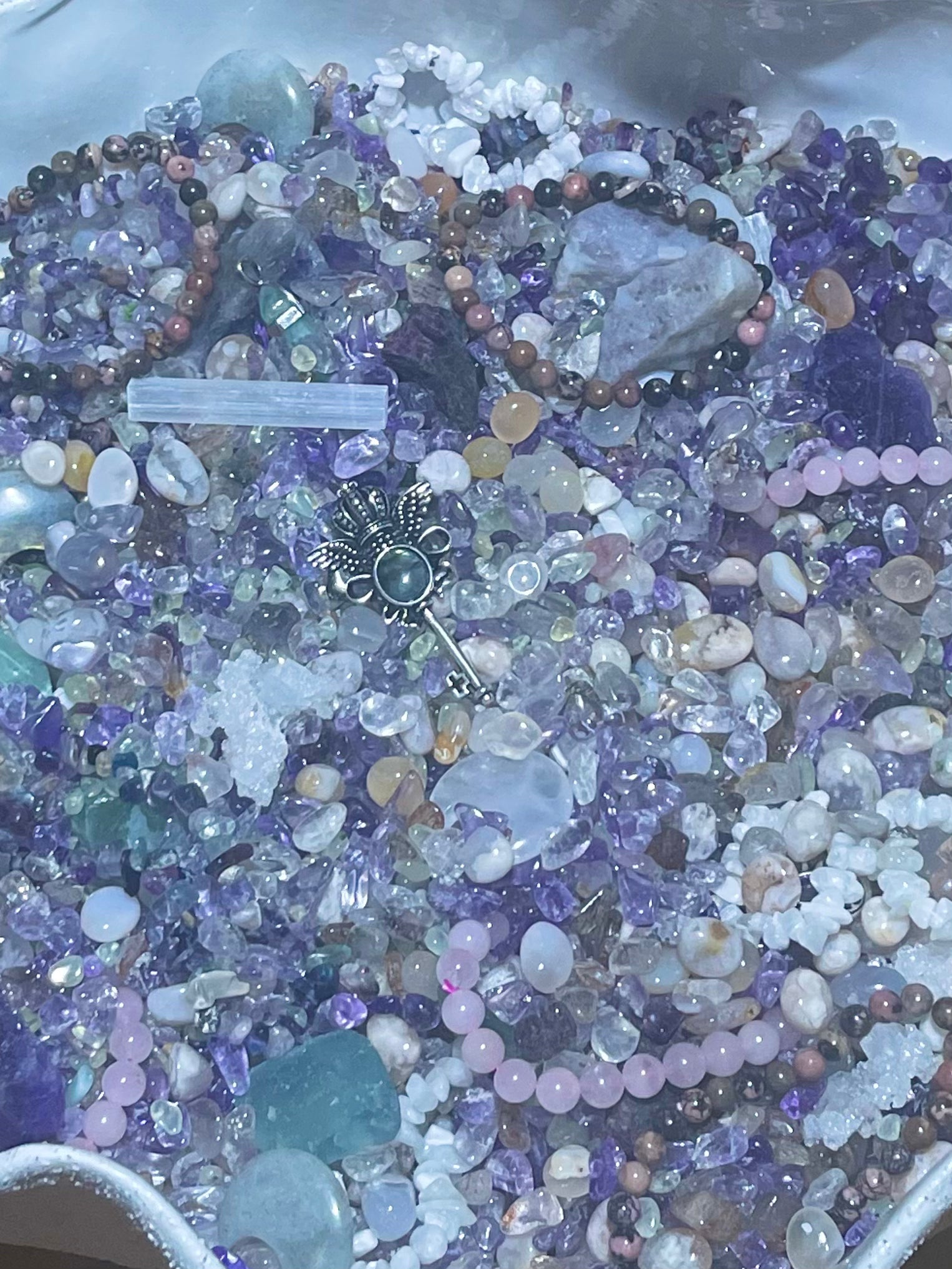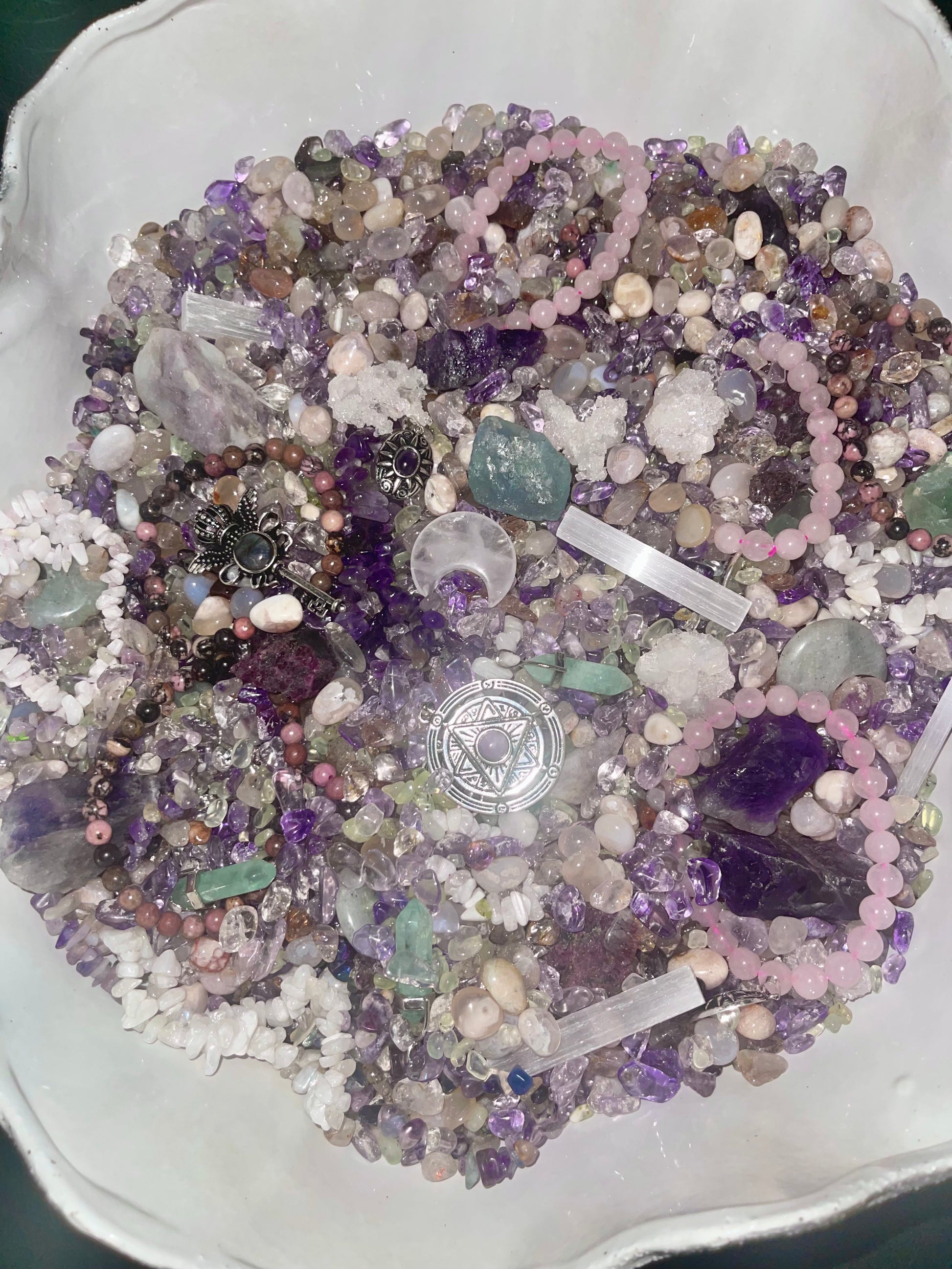 An individual scoop includes a range of crystal treasures such as spiritual adornments/assorted crystal pendants, crystal bead + crystal chip bracelets, sugary + sparkling pink apophyllite clusters, fluorite points, super 7 crystal chips, selenite sticks, labradorite cabochons, flower agate crystal chips, amethyst cabochons, amethyst crystal chips, prehnite crystal chips, assorted raw crystal pieces, witchy apothecary ritual spoons, assorted crystal mini moon carvings + so much more